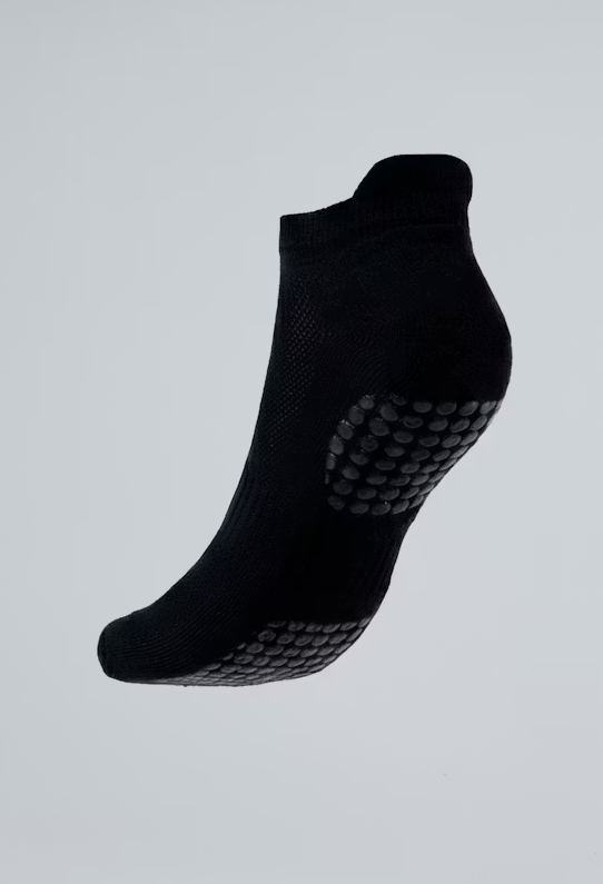 O solado conta com tecnologia antiderrapante, feita em material 100% silicone, projetada para oferecer tração máxima em superfícies lisas. Seja no solo ou nos aparelhos de pilates, você terá a firmeza necessária para manter o equilíbrio e a precisão técnica, garantindo segurança total em posturas de ioga ou movimentos de solo.